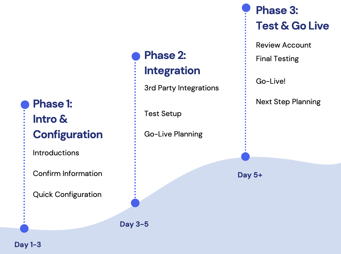 Similarly, onboarding should have waypoints from start to finish, at which there is an interaction with the customer. Each of these points should be both loosely defined as a general onboarding practice and clearly defined on a case-to-case basis with the individual customer.